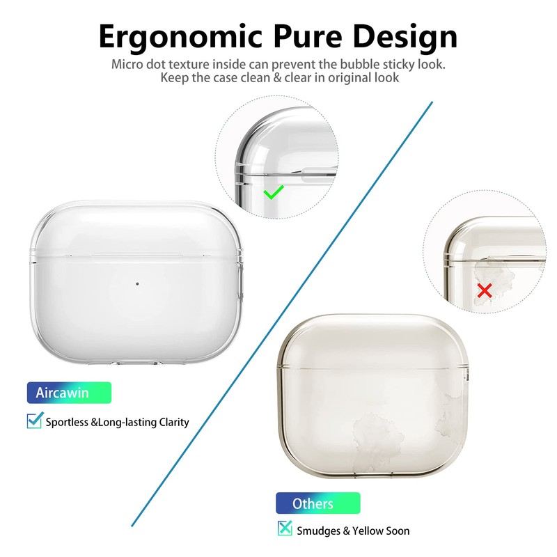 - Spotless Pure& Lightweight - The Air pods charging cas is made of eco-friendly anti-yellow high quality TPU, which is designed to be transparent appearance to show off the original beauty of your elegant 2022 Airpod Pro, The specail interior micro dot pattern can prevent sticky wet look to keep your Airpods Pro 2 neat.