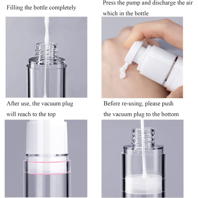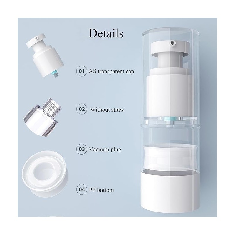 • DESIGN FEATURES: Airless pump bottle with transparent cap, vacuum plug system, and PP bottom construction, measuring 4.6 inches tall and 1.3 inches wide