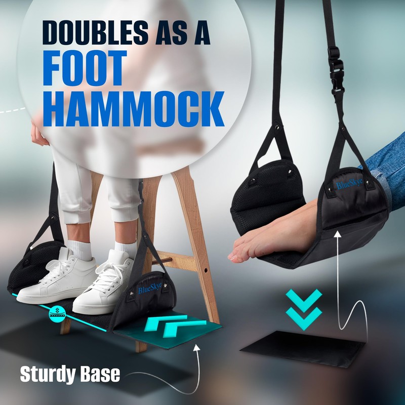 - Travel in Comfort - Our footrest elevates your feet, improving blood flow and relieving pressure from key areas like your lower back, ankles and feet, promoting comfort and better posture. Whether you're sitting at a desk for long hours or frequently traveling on flights, the BlueSkye airplane footrest is designed to ease discomfort.