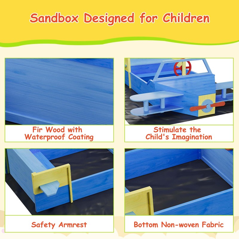 Airplane-Shaped Wooden Sandbox for Kids, Outdoor Playset with Propeller, Rudder & Wings, Eco-Friendly Fir Wood, Bottom Liner, Safe Design for Ages 3-8, Perfect for Backyard, Patio, and Beach
