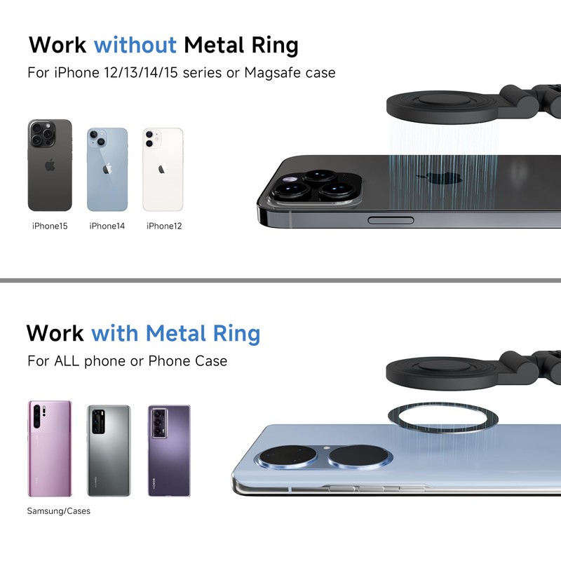 - Compatible with All Cell Phones:Make sure you use a bare iphone or a phone case with Magnetic attraction before trying the Travel phone holder out! Protect your phone while enhancing your experience. Designed for iPhone Magsafe, this Airplane Travel Gadgets can directly adsorb iPhone 16/15/14/13/12 series phones and Magsafe cases. If your phone is Android like Samsung Galaxy S24 S23 S22 S21 or Google Pixel etc. Don’t worry, we have thoughtfully attached a Metal Magnetic Ring for you, which can be easily installed on the back of your phone case and ready to use!