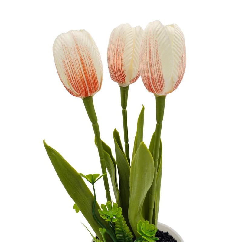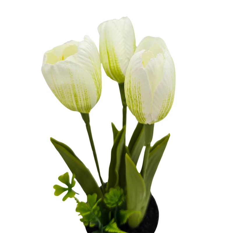 - Size & Color: The artificial potted Tulips are about 10.4 inches tall, the white plastic pot is 3.5 inches high, and the bottom of the pot is 3 inches wide. The flowers are 1.2 inches wide and come in three different colors: light green, light red, and blue.