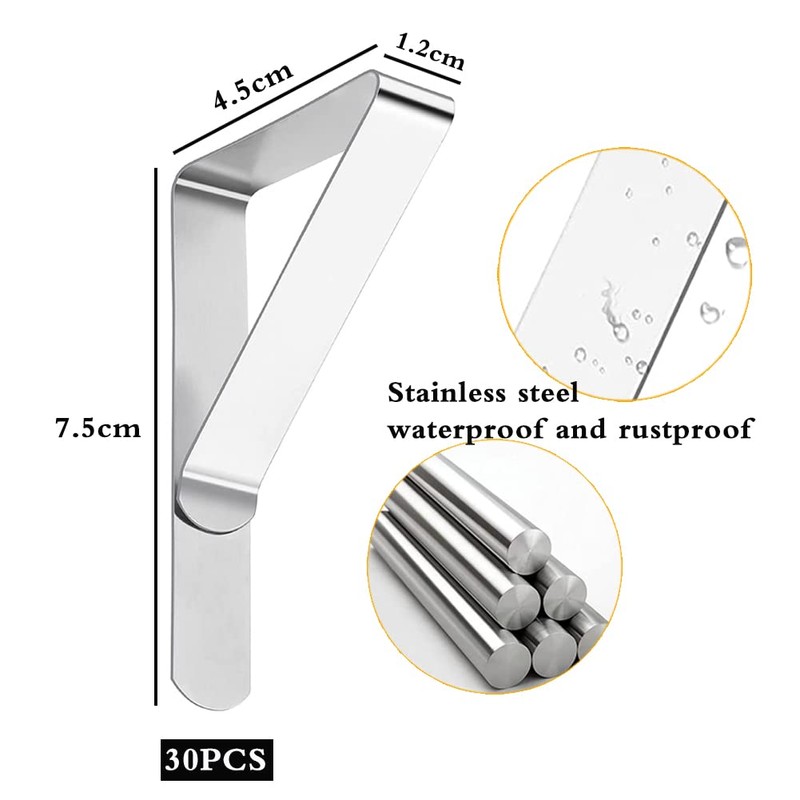 - Quantity & Size Includes 30 pieces stainless steel tablecloth clips length 7.5 cm, height 4.5 cm, width 1.2 cm. Triangle shape in silver.