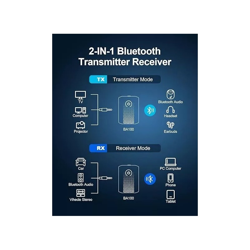 • 【2-in-1 Bluetooth Transmitter Receiver】 In TX mode, the Bluetooth transmitter is plugged into non-Bluetooth devices such as TVs, PCs and MP3 players via AUX/RCA jack and transmits audio to Bluetooth headphones/speakers/soundbars; in RX mode, the Bluetooth receiver can be connected to wired speaker/earphones and to receive audio from smartphones via Bluetooth.