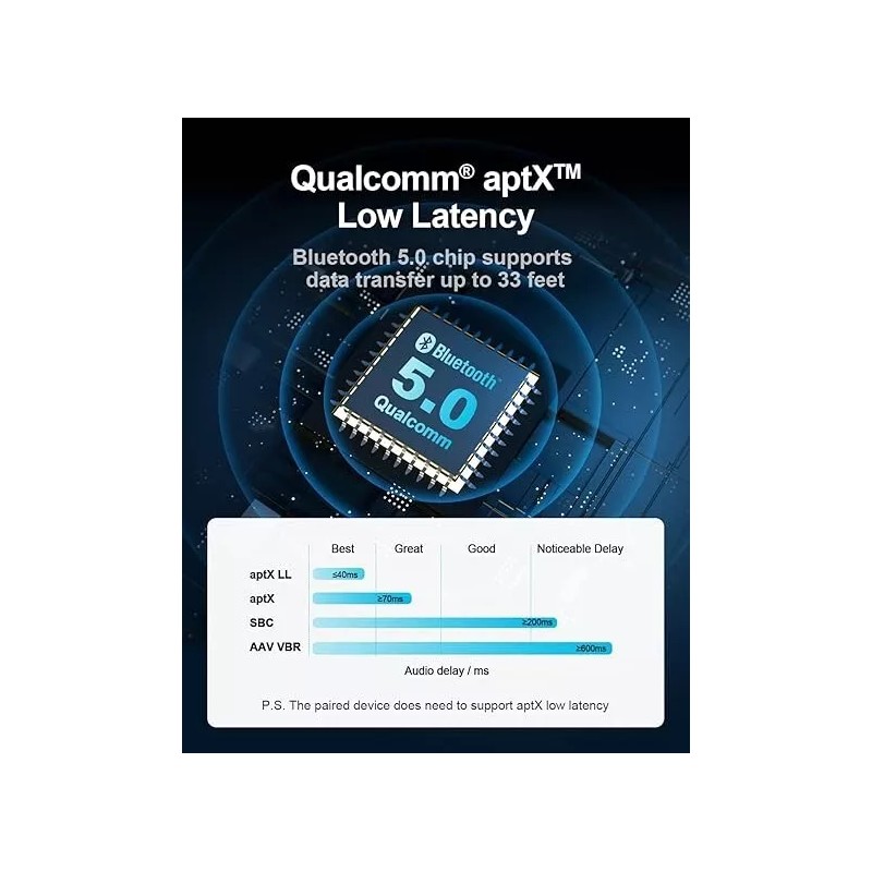• 【Seamless streaming, never miss a beat】 With low latency encoder applied, the audio delay has been minimized to approximately 40ms, the Bluetooth transmitter will present fully synchronized audio and video. Note: Bluetooth headphones/speakers are also required to support low latency technology.