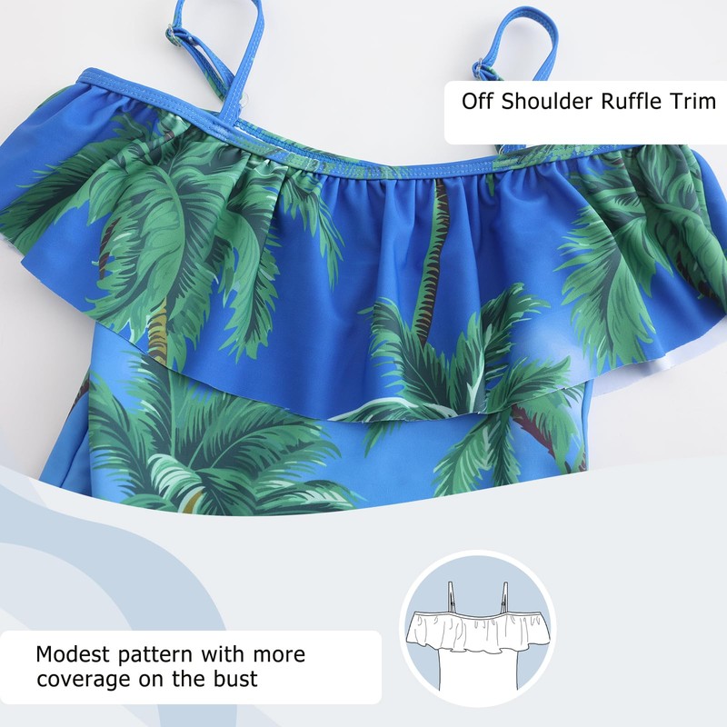 Aisyee Big Girls One Piece Swimsuits Off Shoulder Bathing Suit Hawaiian Floral Swimwear for Kids Palm Sky Off Shoulder Size 12/10-12 Years