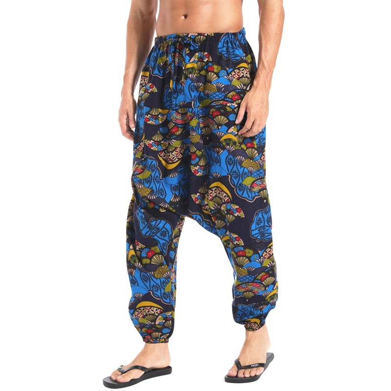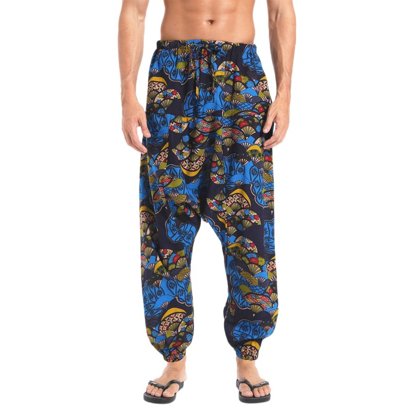 AITFINEISM Men's Causal Harem Pants Loose Drawstring Aladdin Boho Hippie Drop Crotch Trousers (Small, Blue)