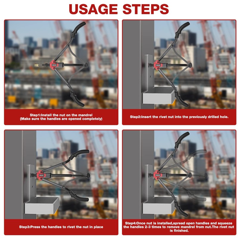 - EXCELLENT DESIGN:Handle connecting rod design, quick release nut structure. Its design makes it easier to rivet nuts. In addition, when the nut riveting is completed, the open handle automatically exits the nut. No need to manually unscrew. It saves 90% more time and effort than a normal rivet tool.New "Toolless Quick-Change Head" design allows for easy changing of mandrels and nose pieces by hand.