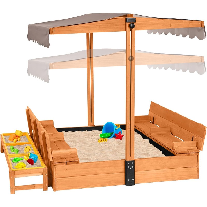 - ⛱️【DETACHABLE CANOPY & 2-IN-1】-The sand boxes for kids outdoor with lid with a canopy can rotate 180°, and it has upgraded height adjusters on the sides to block sunlight from different angles. When you don't need the roof, you can also remove the column to save volume.