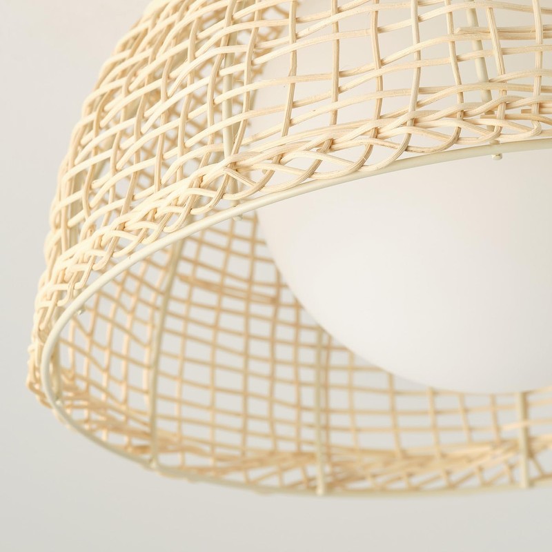 Discover the perfect fusion of contemporary design and natural charm with our modern flush mount ceiling light. Meticulously crafted, this fixture features a captivating semi-spherical rattan shade that encases a smooth, globe glass inner diffuser. This unique dual-layer design creates a warm, inviting, and diffused glow, transforming any room into a cozy and stylish haven. Ideal for those who appreciate a touch of organic texture within a modern aesthetic.
