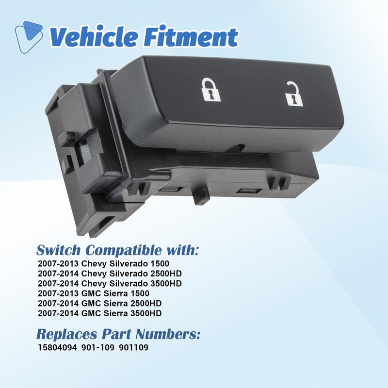 - 【Compatibility】This front right passenger side door lock switch compatible with 2007-2013 Chevy Silverado GMC Sierra 1500, 2007-2014 Chevy Silverado GMC Sierra 2500 HD/3500 HD