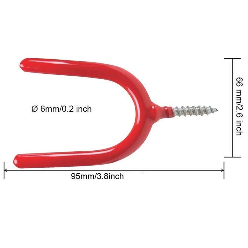 - Large Screw in Hooks:Package contains 10 screw-in wall mount hooks.Red finish.Full length is 95mm/3.8",width is 66mm/2.6",diameter is 6mm/0.24".Hangs vertically for shovels,lawn chairs, brooms,garden tools,extension cords,decorative wreaths and sports equipment or horizontally in series of 2 or 3 U-hooks and hang longer items like flag poles,bats,fishing poles or narrow tubes.