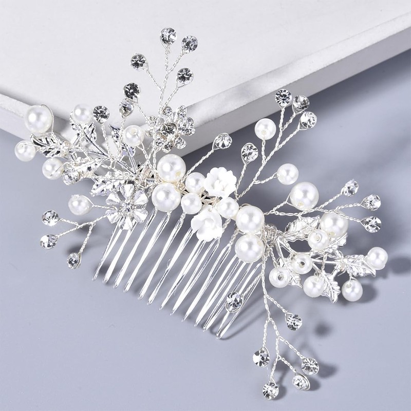 - Silver party hair combs, unique design and well made, made of alloy, flowers and pearls.
