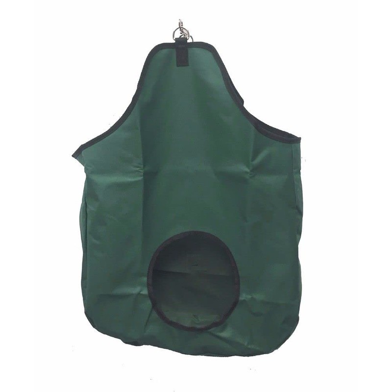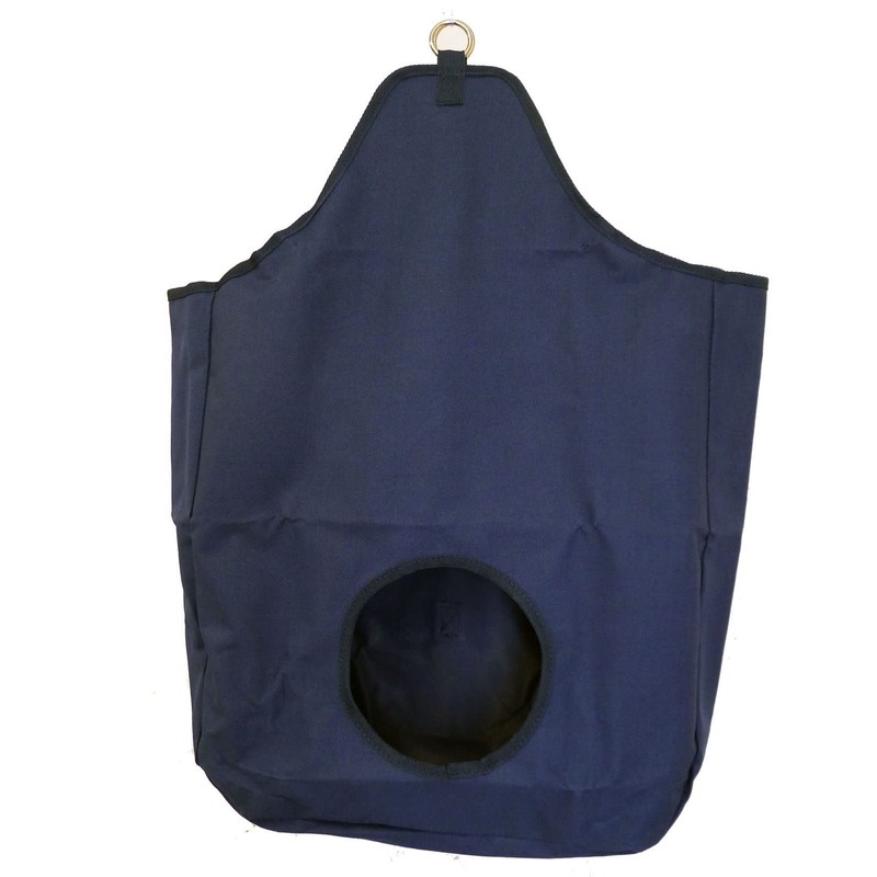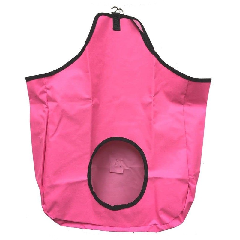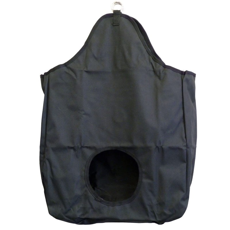 The AJ Tack Hay Bag is constructed with super tough 600 Denier poly PVC coated nylon, offering superior durability for long-lasting use. Perfect for stalls or trailers, this hay bag features two metal rings at the top for easy attachment, and one ring at the back to securely hold the bottom in place. The bag's design helps prevent hay from spilling, making it a practical choice for feeding on the go. Features: 600 Denier Poly PVC Coated Nylon: Tough and durable material designed to withstand daily use. Two Metal Rings at Top: For easy hanging in stalls or trailers. One Ring at Back: To secure the bottom and keep hay in place. Size: 29" tall x 19" wide x 5" deep. Hole Size: 7" for easy access to hay.