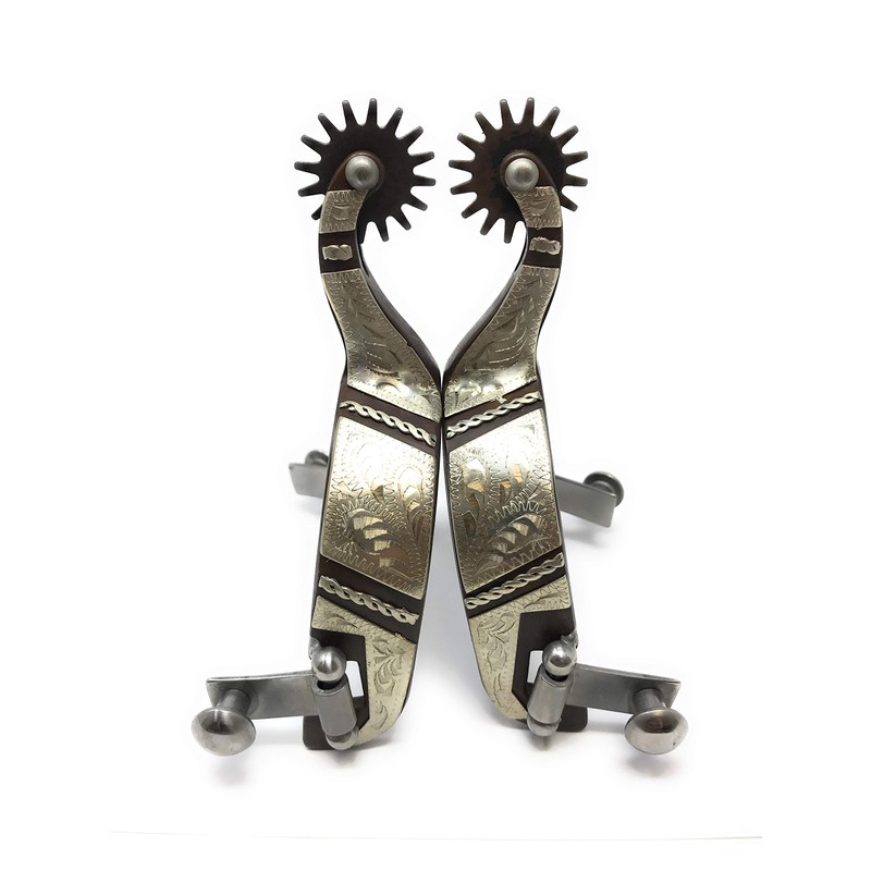 - Pair of western show spurs in antique brown color. Beautiful hand engraved silver overlay.