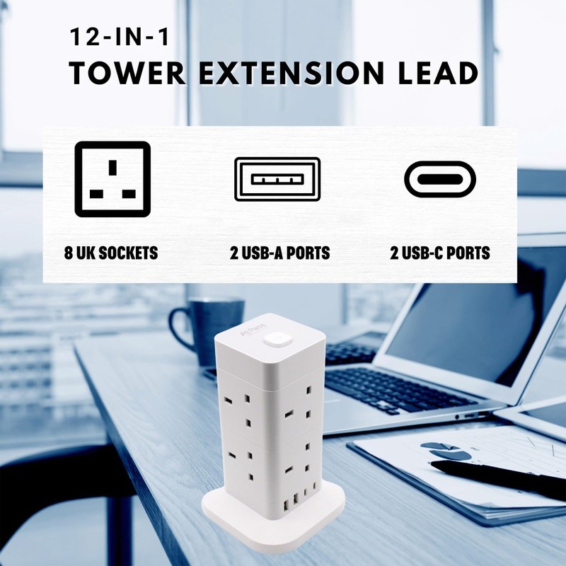 - Experience Unmatched Versatility: AJPARTS UK Tower Extension Lead Features with 8 AC outlets positioned on all sides and 4 USB slots (2 USB A & 2 USB C); Simultaneously charge up to 12 devices; Supports a maximum output of 3250W/13A; Ideal for powering computers, cell phones, tablets, TVs, projectors, and lamps. Perfect for home, office, or kitchen use