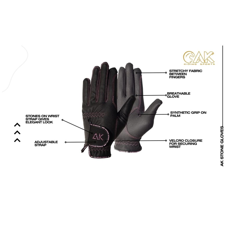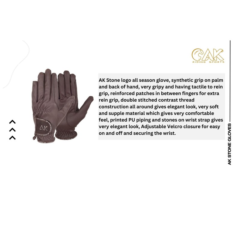 - AK Stone logo all season glove, synthetic grip on palm and back of hand, very gripy and having tactile to rein grip, reinforced patches in between fingers for extra rein grip,
