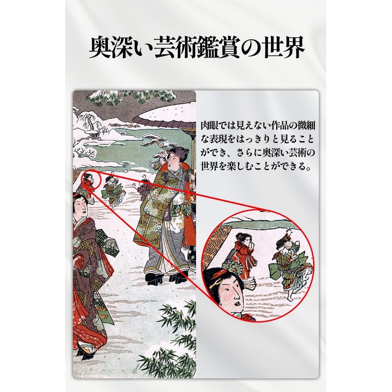 • (Useful in a wide range of situations) This small monocular does not cause shaking, so you can easily see your goals. It is especially recommended for viewing fine art in museums. (To observe the details) Perfect for kimonos, swords, painting, national treasures, jewelry, Ukiyoe, Japanese painting, sculpture, folding screen, western paintings, etc. 【To observe magnification】Perfect for showing charts, signs, sports, bird observation, animal observation, scenery, chalkboard, etc. The perfect place for the elderly