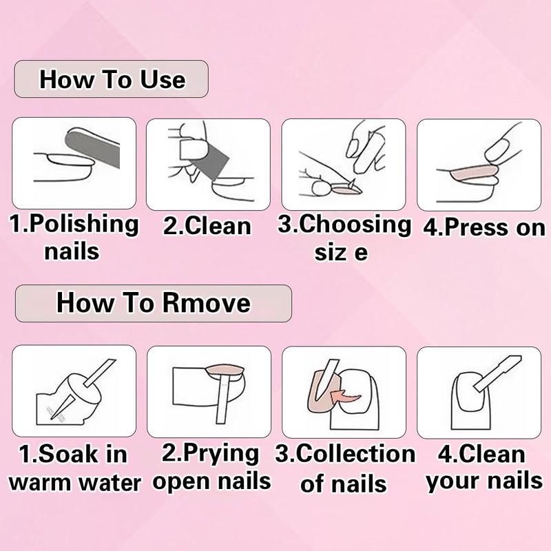3、Press the false nail onto nails and hold firmly for about 30 seconds to secure it in place.