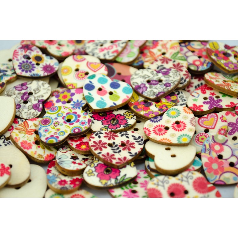 AKORD Mixed Printed Flower Heart Shape Wooden Sewing Buttons, Wood, Multi-Colour, 22mm x 25mm