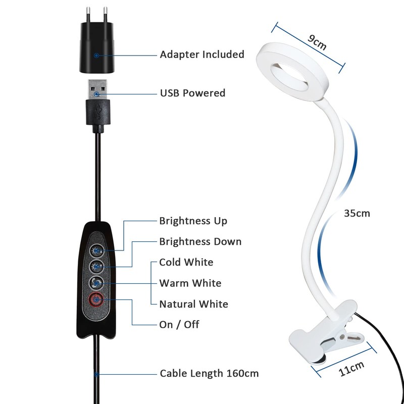 - ??Anwendung: Der USB-Klemmleuchte wei? mit Adapter ist ideal fr Leselampe am Bett, Bettlampe, Schreibtischlampe, PC Lampe, Buchlampe, Nachttischlampe Kinder, Sch?nheitslampe, Make Up Light, Sch?nheitslampe, Handwerkslampe usw.