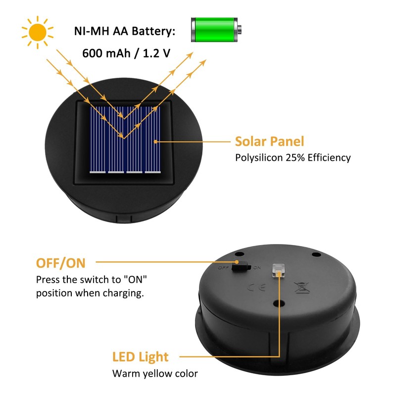 - ? It contains a NI-MH-AA battery with 600 mAh / 1.2V, and the polysilicon efficiency of solar panel is 25%. The LED chip is located on the bottom of the solar replacement top part, provides gentle warm light at dark, 7 lumens.