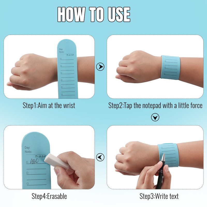 - WEARABLE MEMO BAND: The silicone memo wristband is a practical memory aid, perfect for jotting down shopping lists, study tasks, or to do items. Simply tap it onto your wrist and it will wrap around securely, keeping your notes within easy reach all day long.