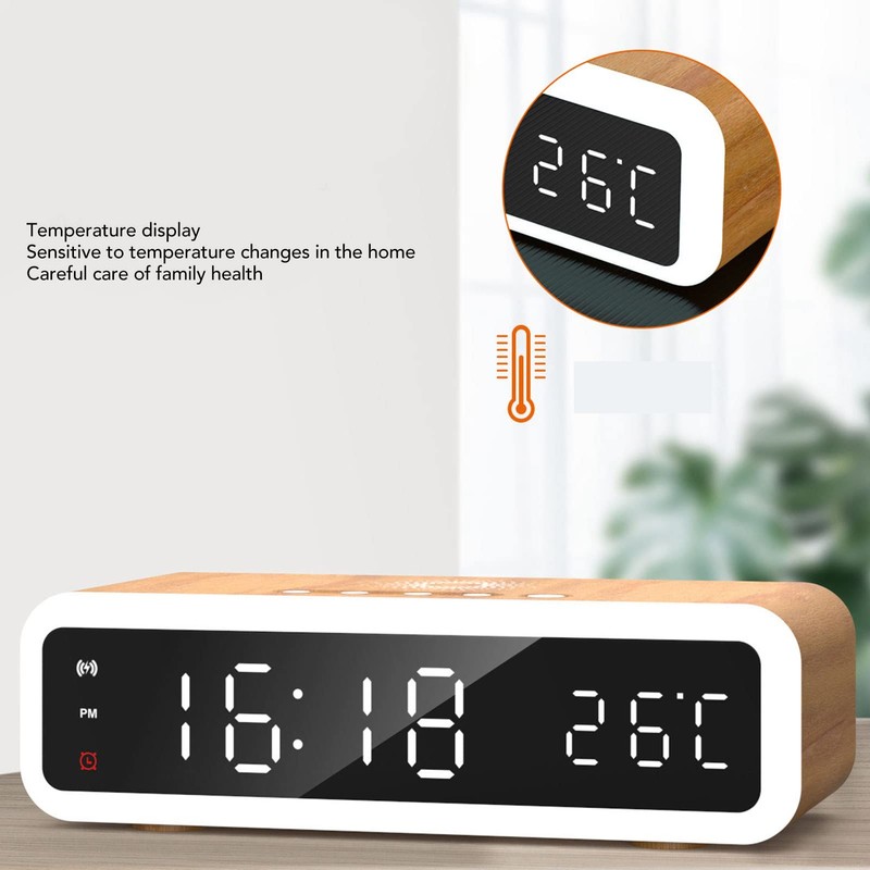Alarm Clock, 15W Digital Alarm Clock Charger, Multifunctional Radio Alarm Clock with 4 Level Dimmer, LED Display Display Time, Date, Temperature, Timer for Bedroom, Bedside, Kids (Natural Wood Colour)