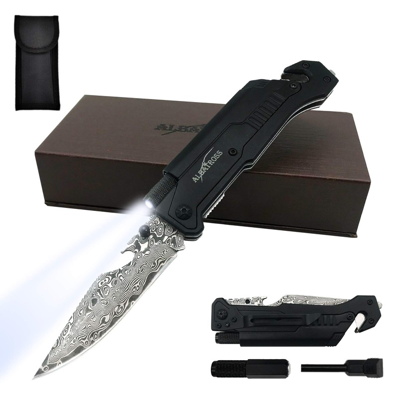 ALBATROSS 6-in-1 Modern Damascus Steel Folding Pocket Knives with LED Light,Seatbelt Cutter,Glass Breaker,Magnesium Fire Starter,Bottle Opener;Multi-Function Emergency Tool(Black-DA)