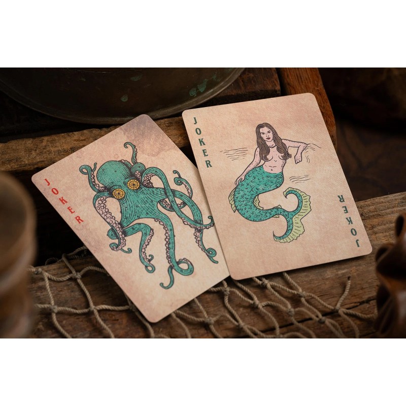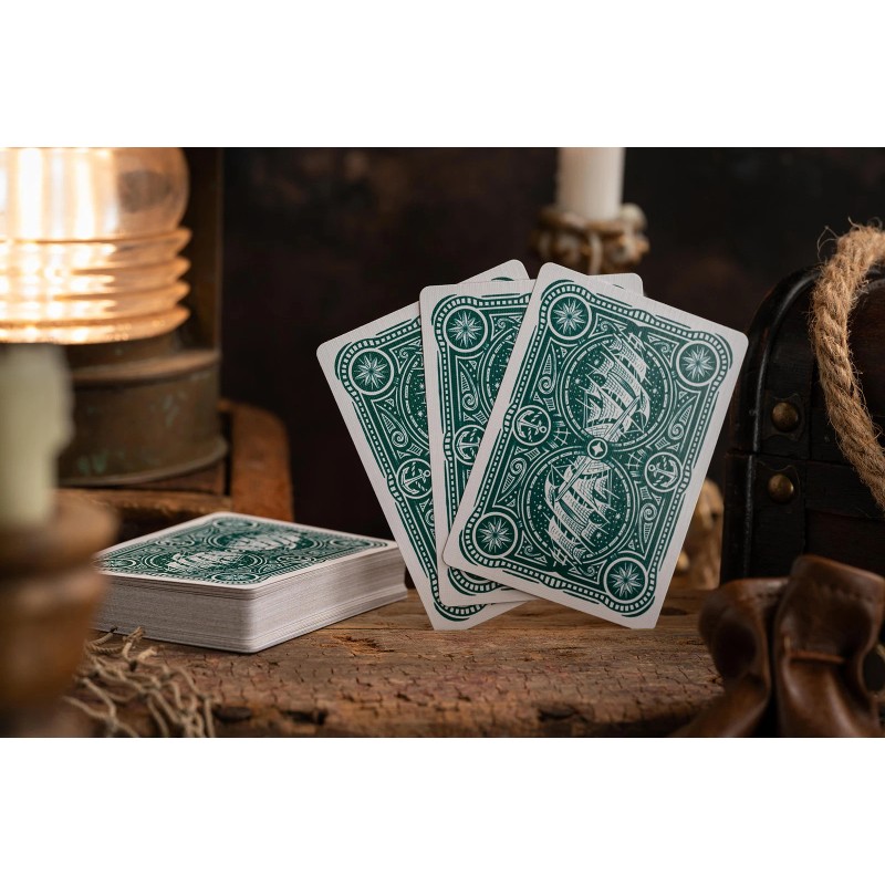 ALBATROSS No. 5 is a fully custom deck of classic playing cards, starting with a blank canvas and illustrated by hand from the ground up, using absolutely no stock elements and zero A.I. This deck has been crafted with the AHPC philosophy of creating a deck of cards that is "standard enough to be usable; custom enough to be collectable", using an aqua colour palette inspired by the sea, this deck sits comfortably on strong traditional foundations while incorporating several more interesting elements. Combining the sensibilities of a classic deck of playing cards with the character of a small-batch rum label, the tuck is printed inside and out on premium matte stock with an aged patina and features the central motif of the Albatross at sea with classic decorations in a deep, dark aqua green. The font on the tuck is expertly applied in glistening red foil and the look is completed with a custom stamp sticker seal inspired by antique postage stamps featuring sailing boats from the 1800s. The back design is classic, bold and timeless, while maintaining a slightly more fun and upbeat style, and features nautical motifs and circular corners designed to catch the eye in a fan or spread... Whether you plan on adding these to your display or collection, performing Magic or Cardistry, or using them for card games such as Poker or Whist, you will find the Albatross No. 5 Playing Cards have managed to strike that perfect balance between form and function, as was intended at every stage of the design process. Features of this deck include: Matte tuckbox printed inside & out with foil application on the outside 55 poker size playing cards featuring 2x Jokers + 1x extra card Premium quality - printed by Legends on pre-crushed stock with Classic Finish Fully custom artwork throughout - drawn by hand - nothing stock & no A.I.