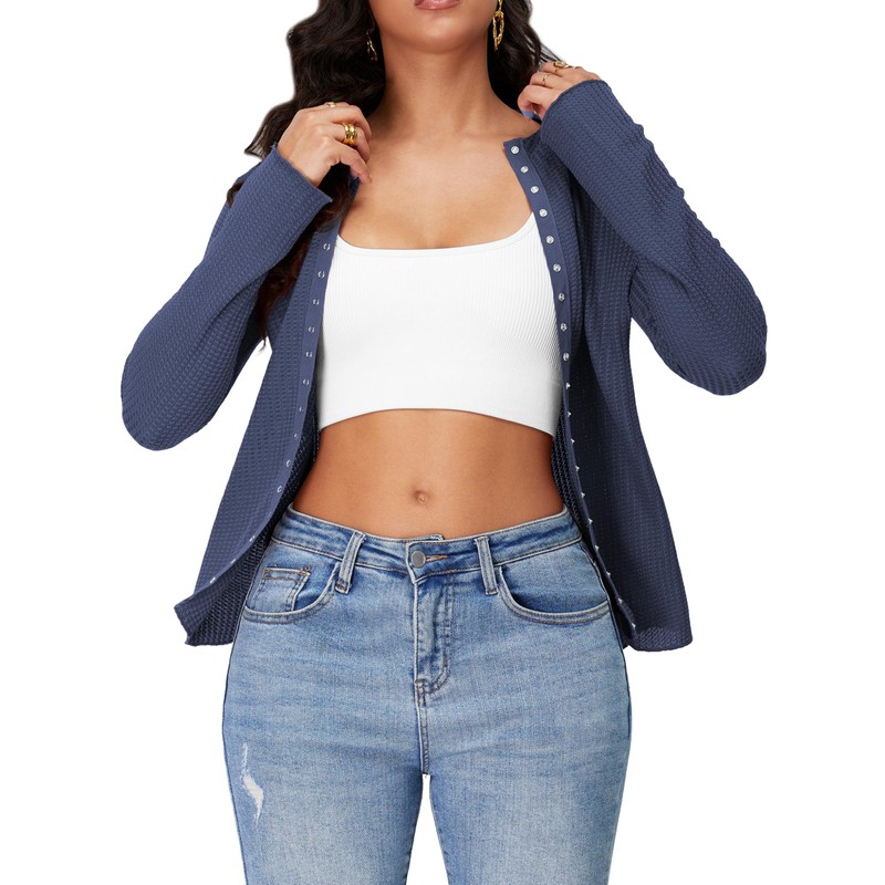 Albe Rita Waffle Cardigan Sweater Shirts for Women Lightweight Button Down Long Sleeve Crew Neck Knit Swater Tops,Navy Blue,S