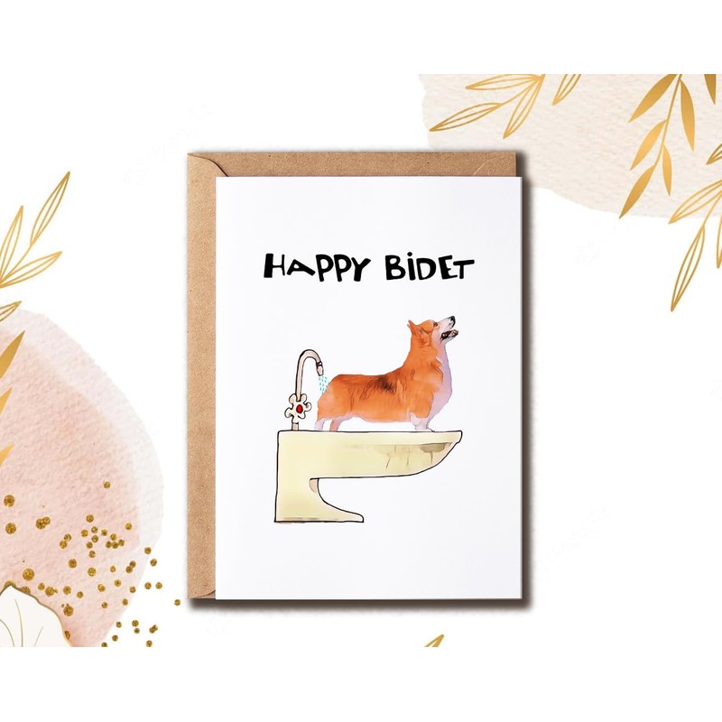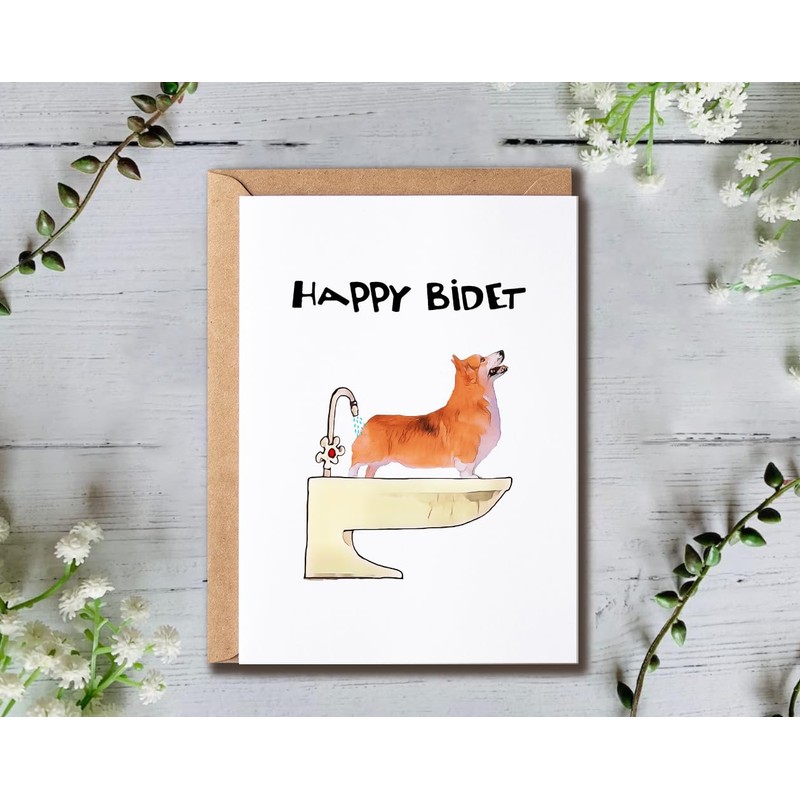 ALDDesigns Happy Bidet Card - Corgi Dog Card - Toilet Pun Card - Corgi Greeting Card - Card For Friends - Corgi Birthday Card