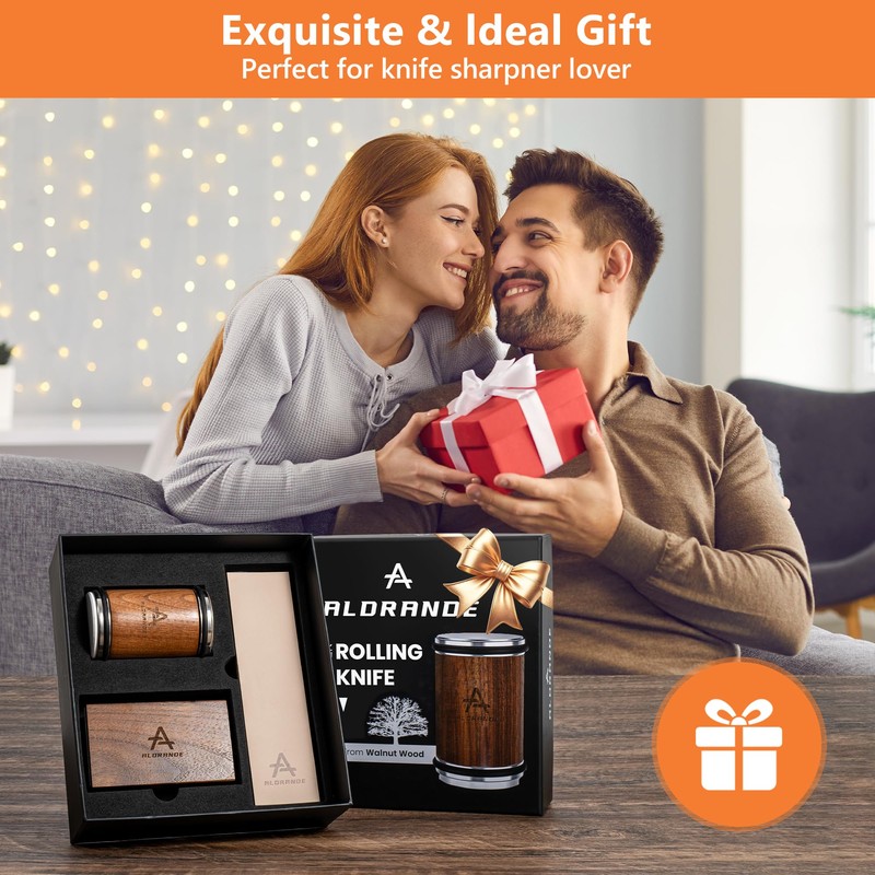 - ACCURATE AND LONG LASTING SHARPNESS: The Aldrande Rolling Knife Sharpener sharpens your knives in seconds with a gentle rolling motion without damaging the blade. The leather strop for the knife sharpener gives your knives a smoother and shinier surface after sharpening.