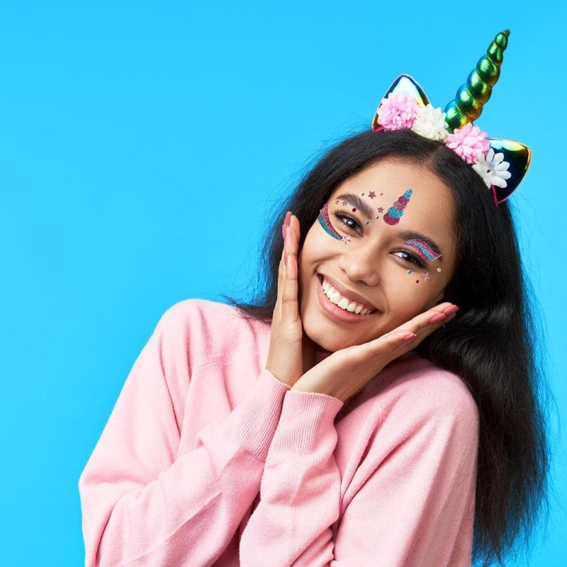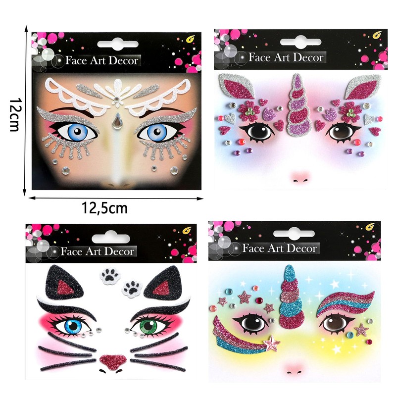 - Carnival face tattoo: 4 sheets of glitter face art stickers with different shapes, including unicorn, cat, elf face tattoos. Use these temporary face tattoos to emphasise your beautiful masquerade make-up, perfect carnival party favors costume accessories