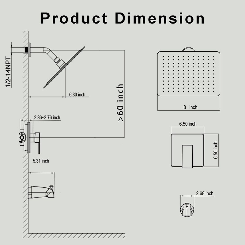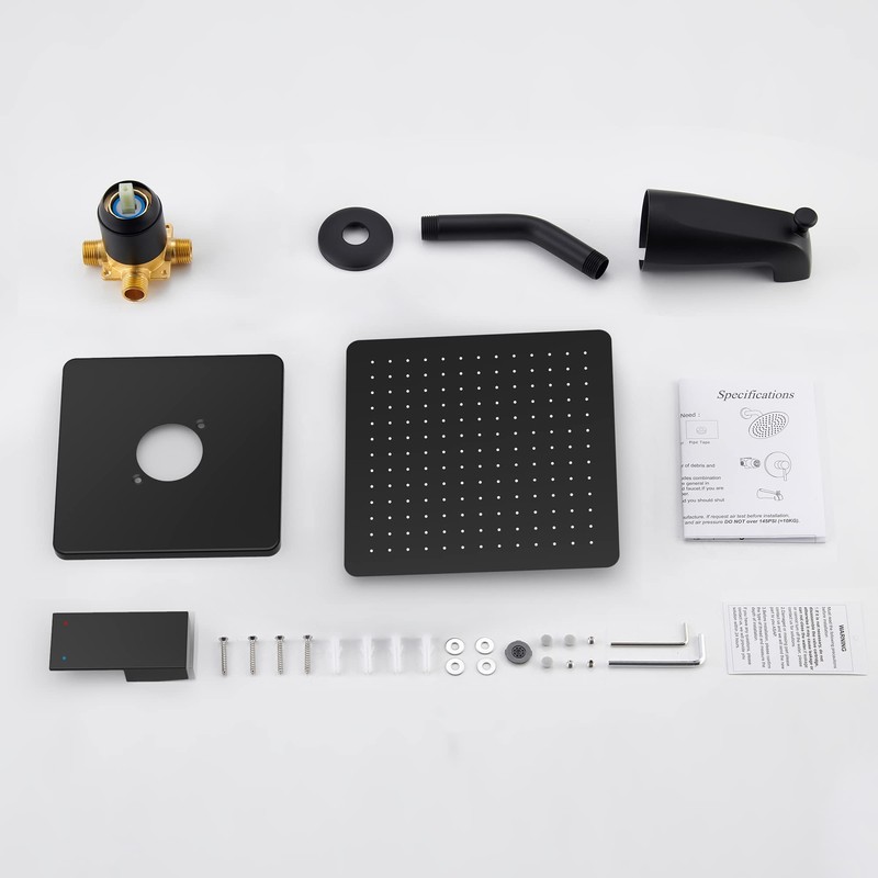 - Tub Shower Faucet Set include: 8-inch square rain shower head, shower valve and trims, 5.3-inch tub spout, installation guide and all necessary hardware.