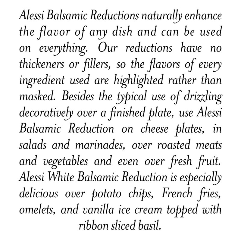 - TRY IT ON: Alessi White Balsamic Reduction is especially delicious over cheesecake, grilled peaches and feta cheese, and vanilla ice cream with ribbon sliced basil