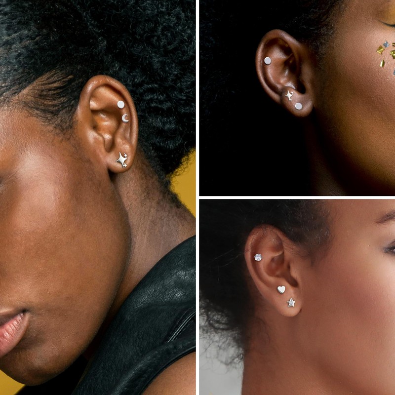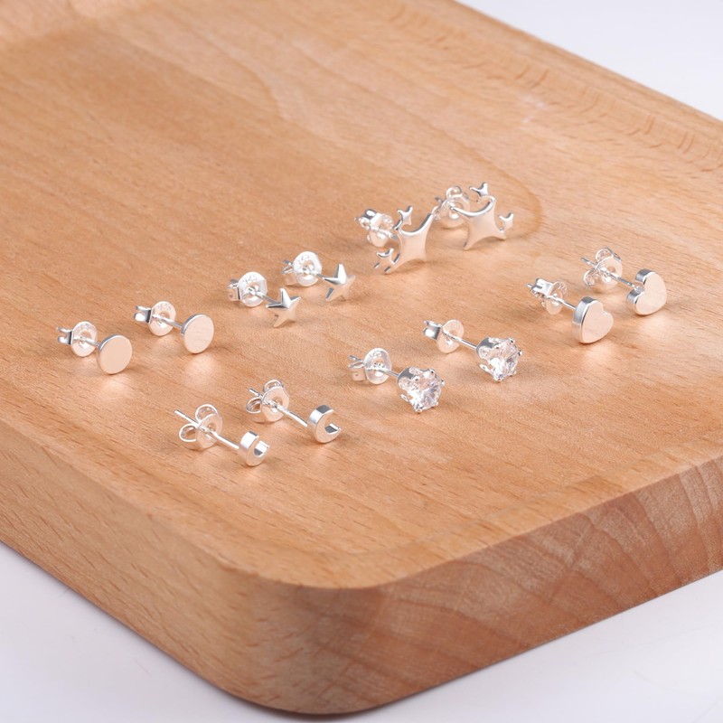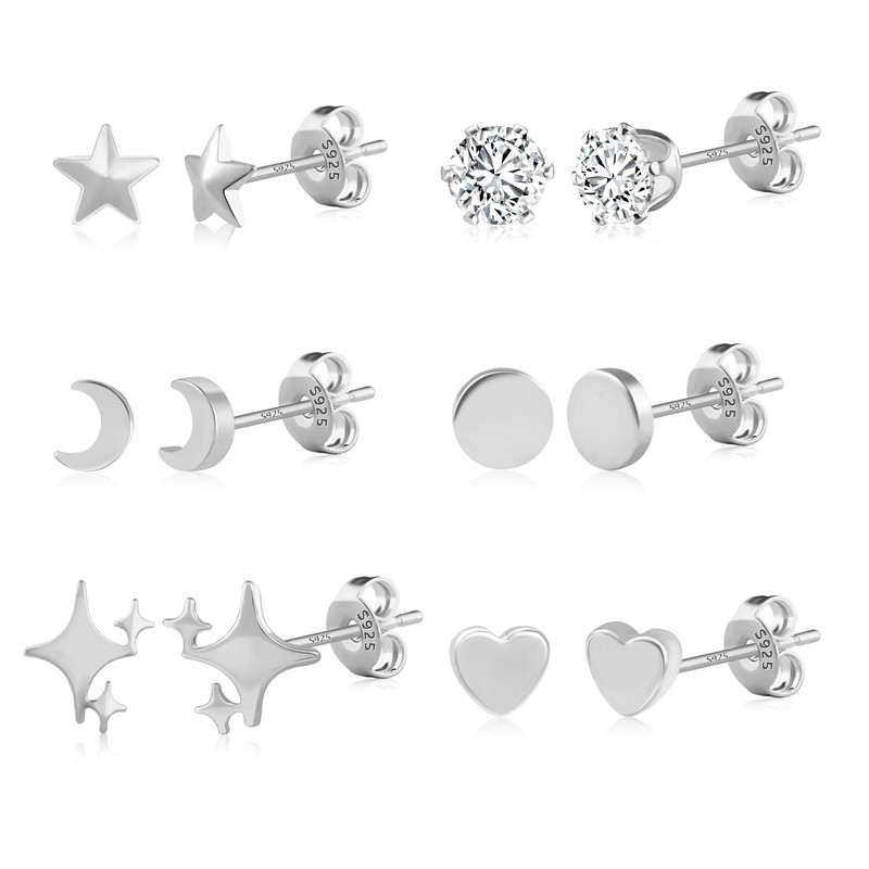 - Fashion Style Small Silver Stud Earrings: 5mm Moon Stud Earrings, 5mm Star Stud Earrings, 11mm Triple Star Stud Earrings, 5mm Round CZ Stud Earrings, 5mm Round Flat Disc Stud Earrings, 6mm Heart Shaped Flat Disc Stud Earrings. These sparkling silver stud earrings have enjoyed great popularity for years because of their refined yet simple design and can perfectly meet your different clothing needs.