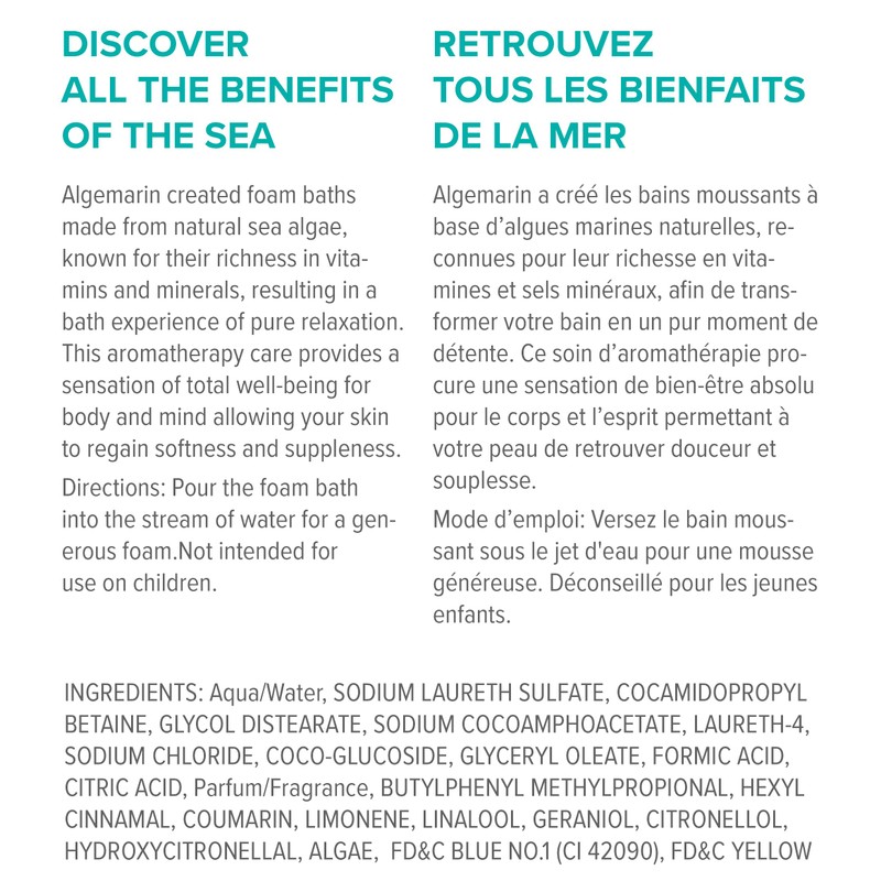 - DEEP MOISTURIZING FOAM BATH : Suitable for all skin types, this aromatherapy foam bath will provide a sensation of total well-being for body and mind allowing your skin to regain softness and suppleness. This Algemarin foam bath will not only cleanse your skin, but gently moisturize it.