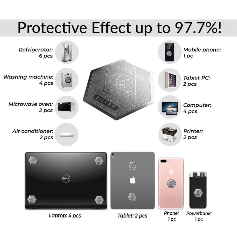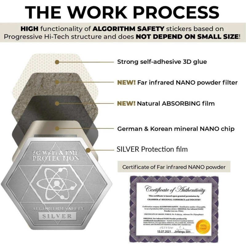 ALGORITHM SAFETY stickers have a superior structure, made with a SILVER protection film, FarInfrared NANO Powder filter, and a mineral Jade chip that provides top level protection. They have a Matt SILVER luxurious design, with a silver finish that looks amazing on every device. The stickers are compatible with popular devices, such as mobile phones, tablets, laptops, and household appliances, such as the fridge, microwave, or oven.