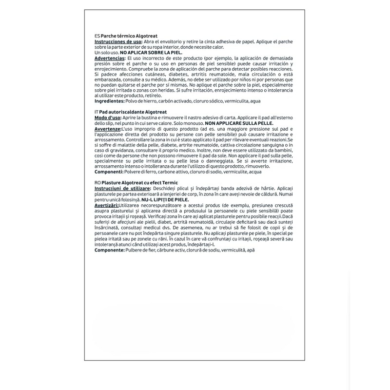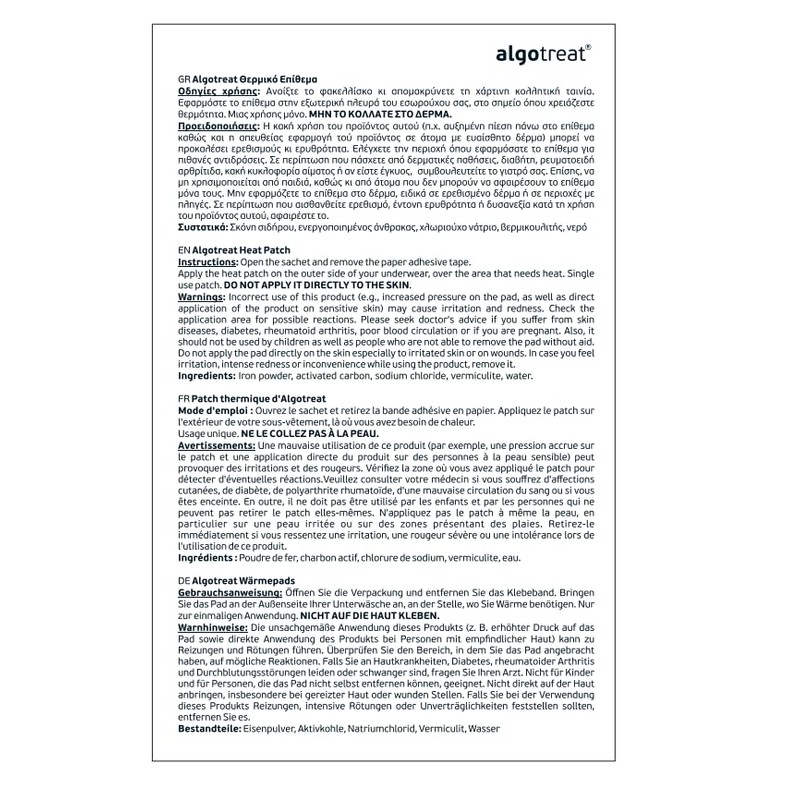 - Discreet and comfortable - The heat patch should not be attached to the skin, but to your garment or underwear. The Algotreat therapeutic heat patch is odourless and contains natural ingredients (iron, cardboard, salt and water)