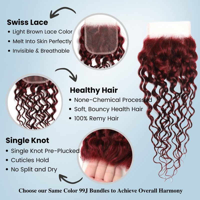 99j wine red water wave Hair Closure Grade: 12A water wave Human Hairclosure 12 14 16 18 nch, With More Bounce,Thicker Ends,Shinier Wavy Hair