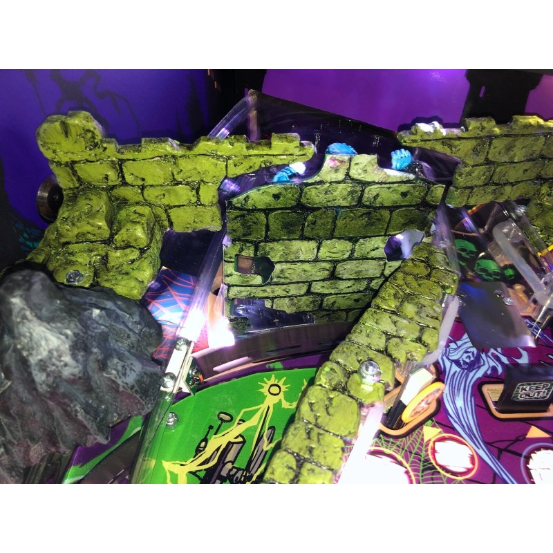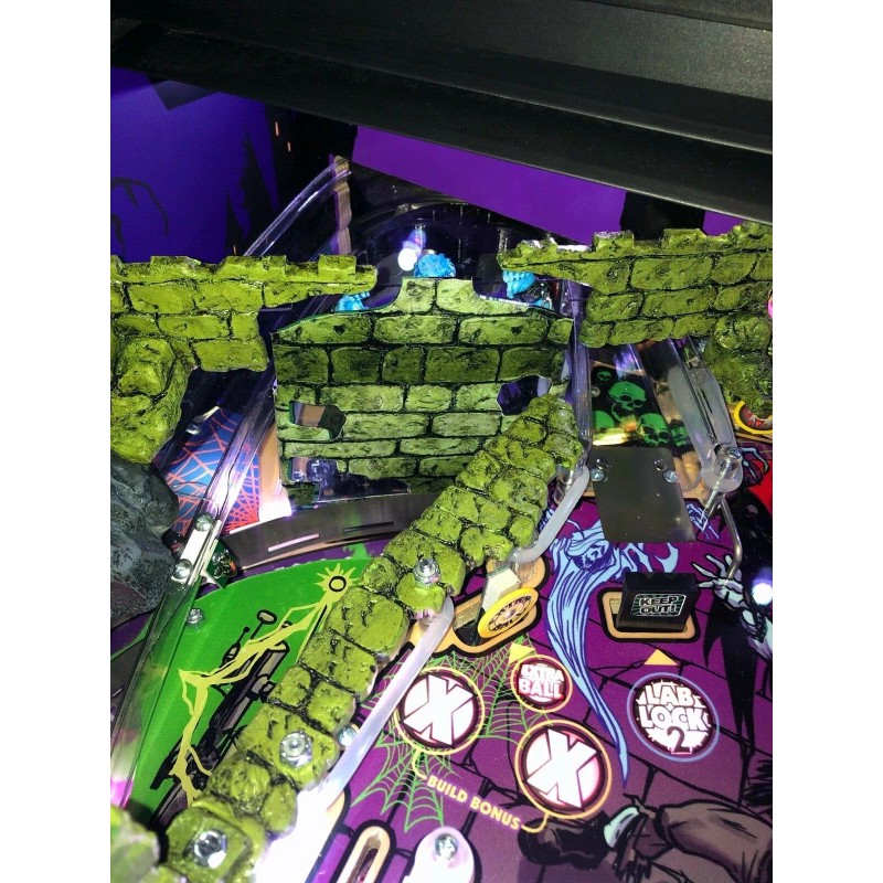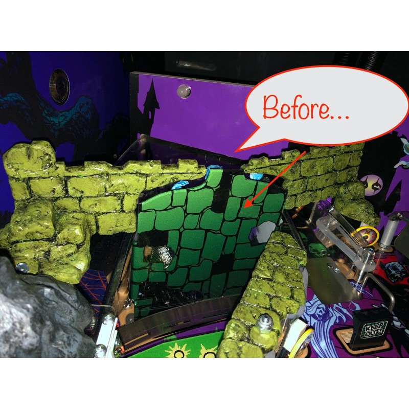 Alice Cooper's Nightmare Castle Pinball "Castle Wall" Mod-  Cover up that ugly castle wall that doesn't quite look right with a high quality vinyl decal(with cut outs) that replicates the brick pattern of the molded castle pieces on your machine.  Does not interfere w game play at all. Installation does require that you remove castle wall pieces on left and right side, patience and a steady hand. Once decal is aligned, trimming with razor blade will be needed along top and sides.  shipping in Cont US is $7.99
