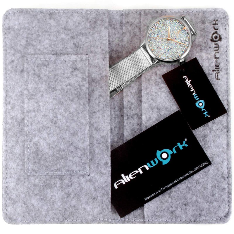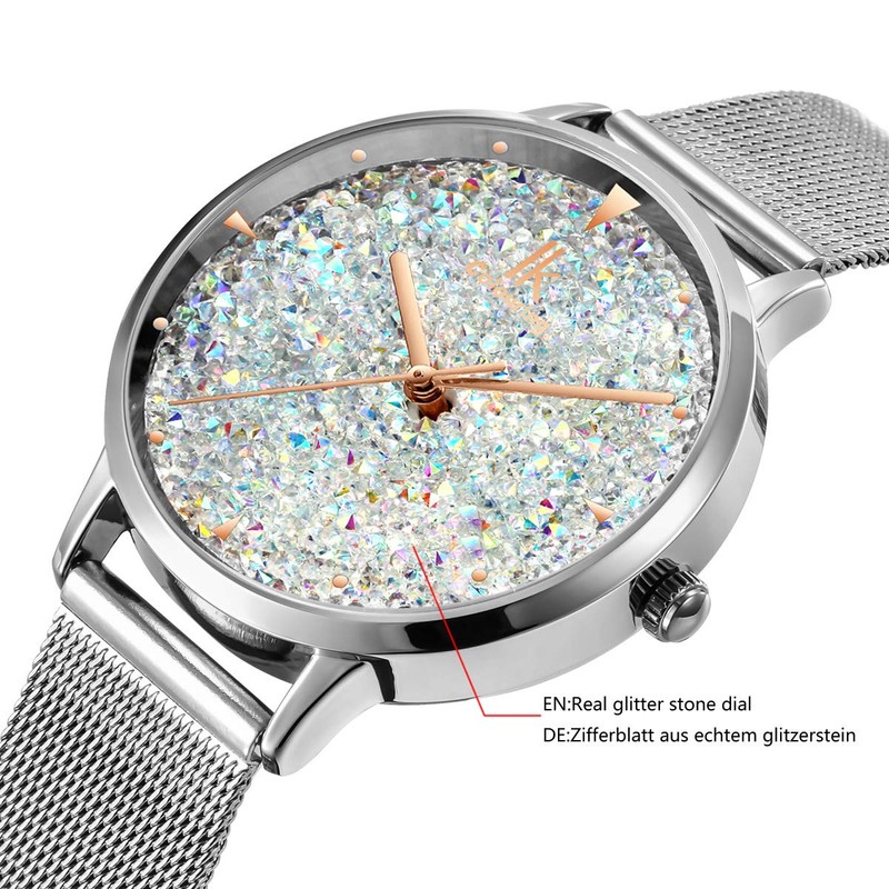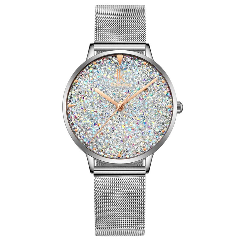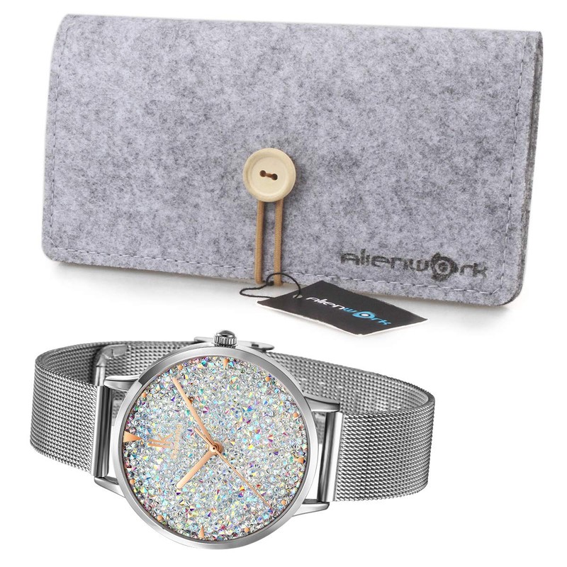 Alienwork Women's Watch Silver Metal Mesh Strap White Rhinestone Glitter Elegant