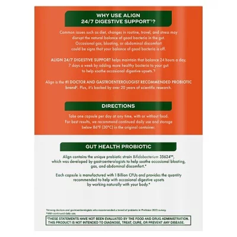 Align Probiotics contains the proprietary strain Bifidobacterium 35624 TM, developed by Gastroenterologists. This strain helps soothe occasional abdominal discomfort, gas, and bloating, promoting a healthy balance of intestinal flora.