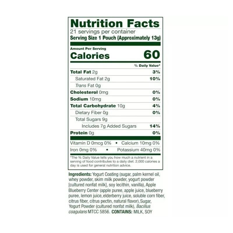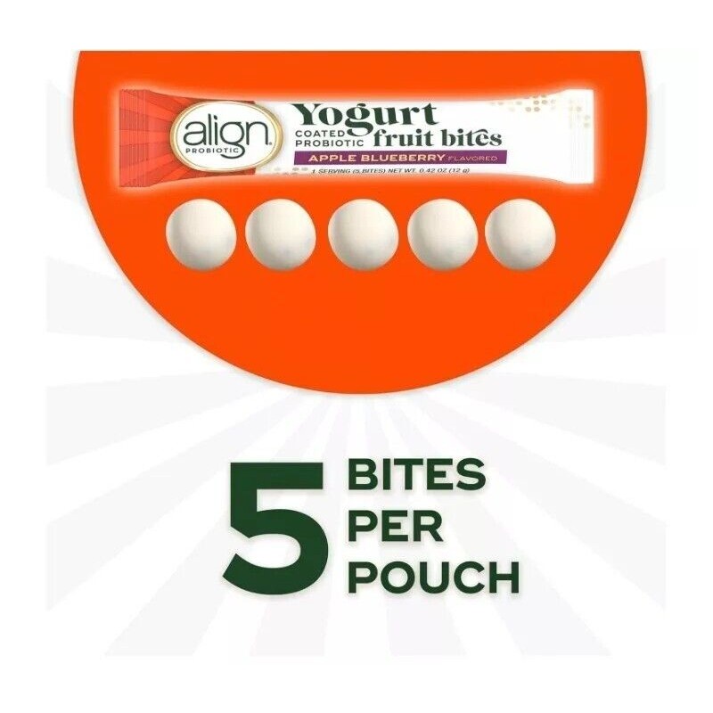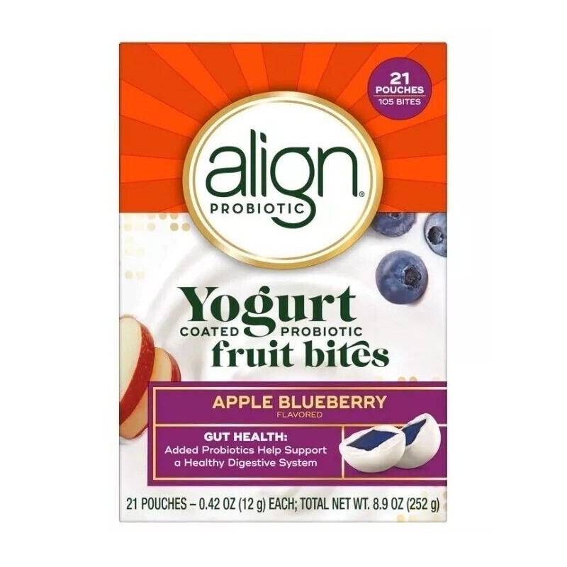 Align Yogurt Coated Probiotic Fruit Bites are a delicious way to add probiotics to your gut every day to help support digestive health. Every apple blueberry flavored fruit center is paired with a tasty yogurt coating and infused with gut health probiotics. Each box contains 21 individually wrapped pouches of 5 bites and does not require refrigeration, making them great on-the-go so you can enjoy them anytime, anywhere! Look forward to helping support your gut health everyday with great tasting bites! Align is the #1 doctor recommended probiotic brand and is recommended by doctors nearly 2X more than any other probiotic brand.‡‡ Align Yogurt Coated Probiotic Fruit Bites are backed by a money back guarantee so you can try risk-free today! ***Procter & Gamble stands behind our product. If you are not satisfied with Align, simply return the UPC code from this package and your original sales receipt within 60 days of purchase for a full refund in the form of a prepaid card. Visit AlignProbiotics.com/Refund for details. ‡Among Doctors who recommended a brand of probiotic in ProVoice 2008-2023 survey. ‡‡ Recommended 1.75x more among doctors who recommended a brand of probiotic in ProVoice 2023 survey.