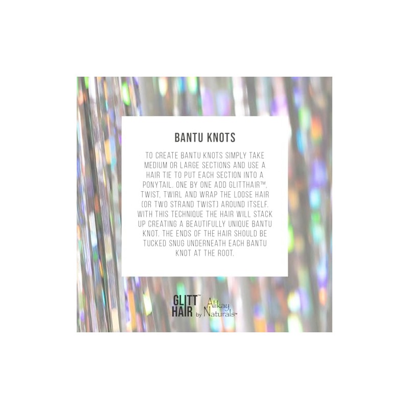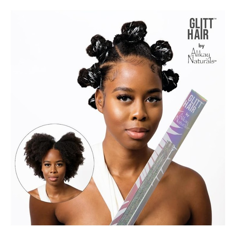 This Y2K trend is back!!! Get into it with GLITTHAIR by Alikay Naturals. This collection of chrome-colored, sparkly, and glittery hair tinsel extensions has 17 color variations that will make you stand out in any party and make any style pop! Each box comes with approximately 200 hair tinsel strands that can be installed into extensions or on natural hair, for quick and easy styling. Works great with All hair textures! GLITTHAIR Hair Tinsel Extensions are heat resistant up to 300 degrees so you can Wash, Curl, Blow Dry and Style your hair in any style in you want. Bring out your creativity with these FUN, BOLD, & VERSATILE hair extensions! Storage Tip: Store your GLITTHAIR️ in the original packaging with tie to prevent tangling. Before placing in the box, ensure to detangle the strands to prepare for next usage.