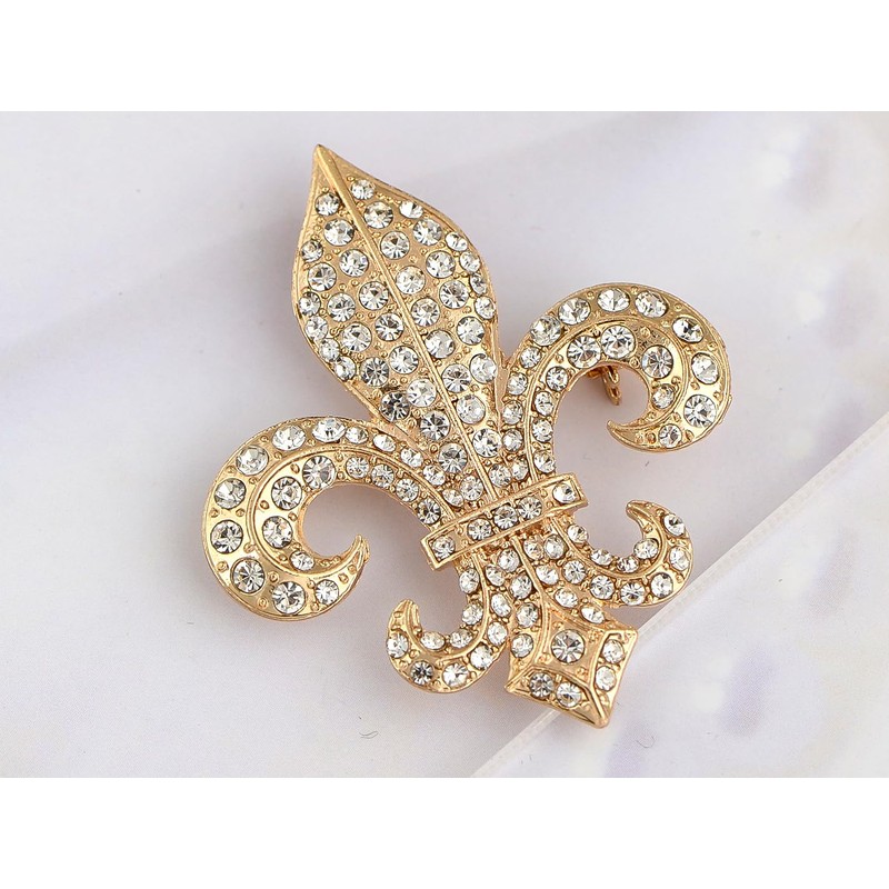 - Royal brooch pins - this stunning brooch featuring a fleur de lis design, adorned with sparkly clear crystal rhinestones, or painted black enamel, and silvery/ copper/ golden tone metal alloy base.