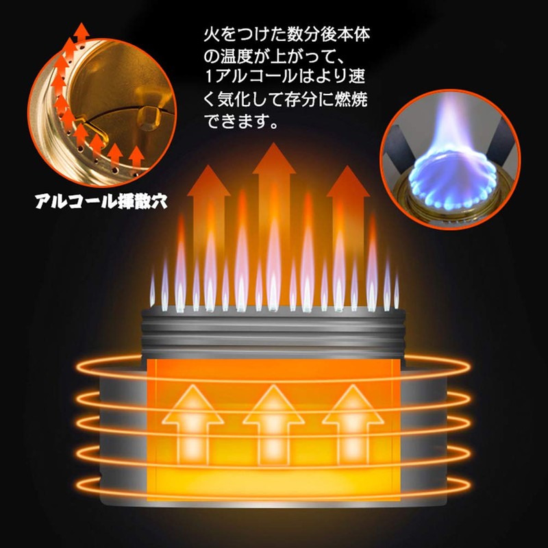 - 省エネ:本体は真鍮で作り、一体構造、非常に丈夫です。そして、ストーブ本体の底部に三つの穴があり、芯がアルコールに浸透やすく、燃焼率も高く、省エネです。