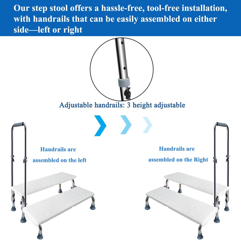 - Flexible Adjustable Soft Handle: Our elderly step stool with handle offers five adjustable heights ranging from 34.8 inches to 38.8 inches, with the handles being freely installable on both sides. The easy-to-grab handle can help maintain balance and meet the needs of users of different heights, dominant hands, and surrounding environments
