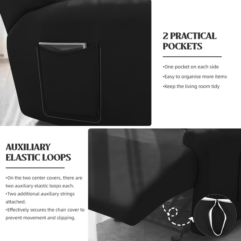 - 【4-PIECE DESIGN】The 4 piece recliner chair cover includes 1 back cover, 1 seat cover and 2 armrest covers. The 2 armrest covers both have pockets to easily store small items such as remote controls, glasses, magazines, newspapers and more. The elastic band at the bottom can be hung on the metal parts to hold the chair cover firmly in place and will not move.